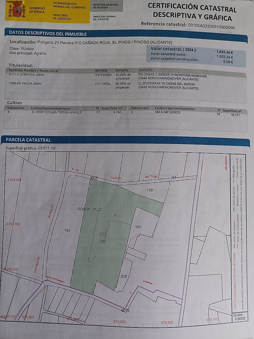 El terreno, de 26.500 m², es muy privado, está plantado con 300 almendros y ofrece preciosas vistas. Tiene acceso asfaltado, conexión a la red eléctrica y al agua potable. Hay agua potable en la calle y se puede conectar (el ayuntamiento ya ha realizado un estudio para ello).