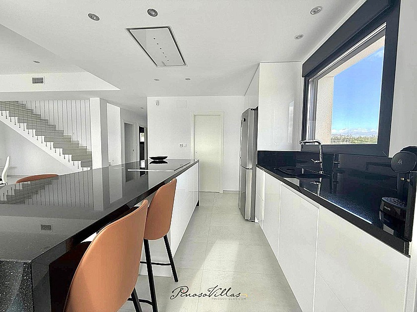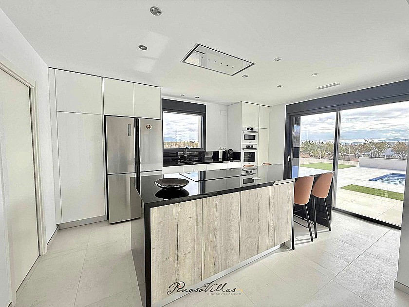 La moderna cocina cuenta con una isla ideal para el entretenimiento y un amplio lavadero para mayor comodidad. El luminoso y espacioso salón tiene vistas a la piscina y ofrece impresionantes vistas a las montañas.