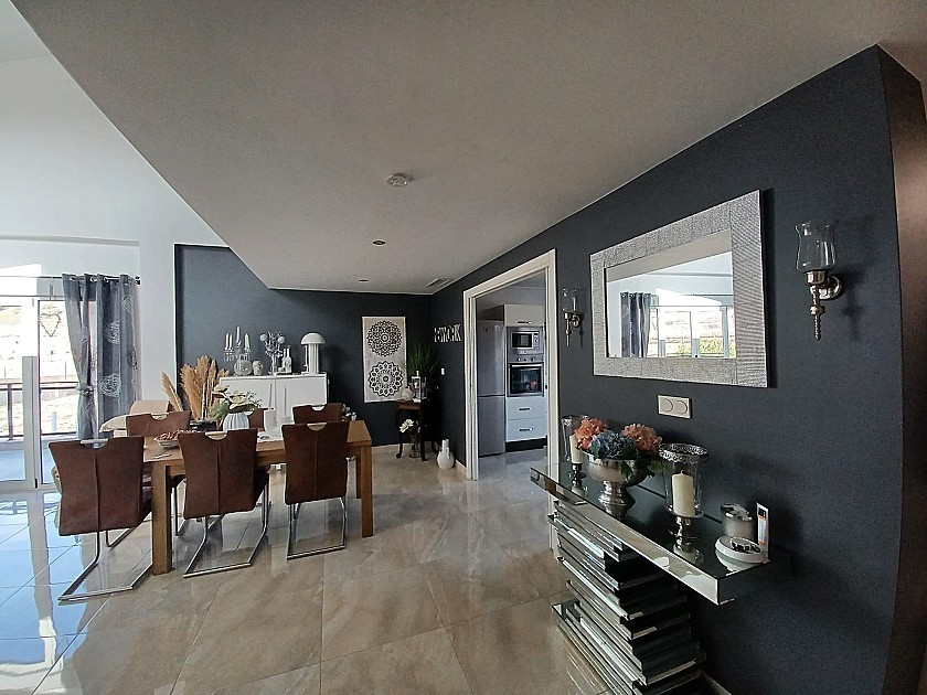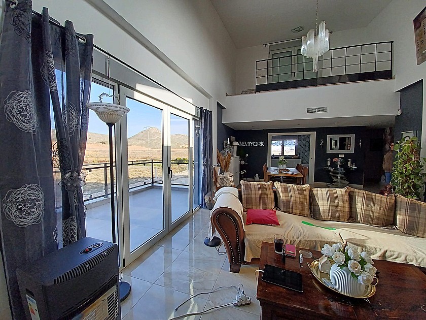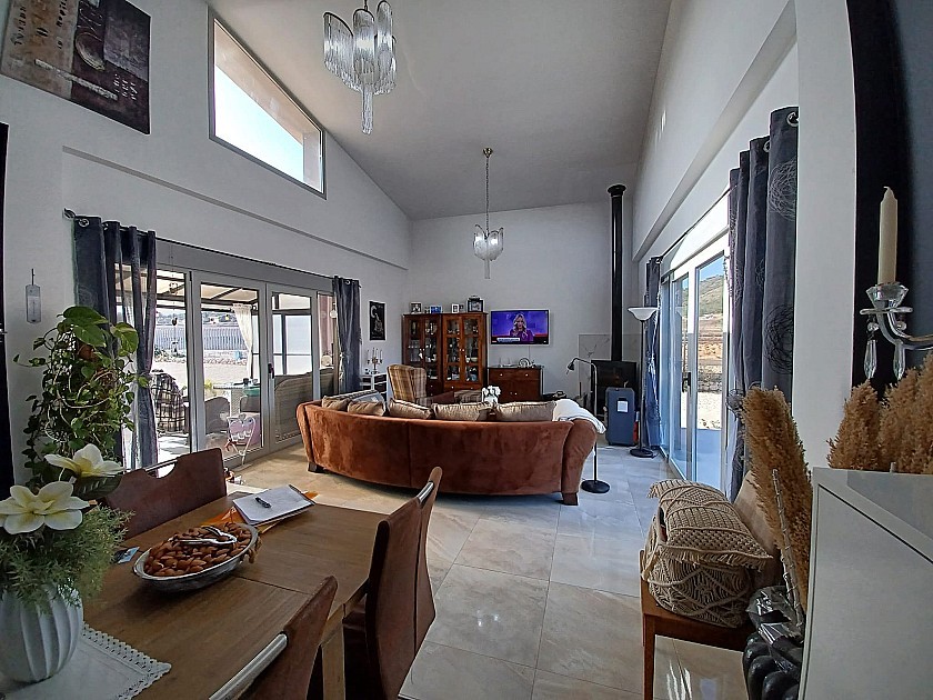 Bij binnenkomst komt u in de hal die toegang geeft tot de woonkamer met een hoog plafond, zijramen en een mezzanine die uitkomt op een heerlijk dakterras. Vanuit de open woon-/eetkamer met houtkachel leiden grote openslaande deuren naar twee terrassen aan weerszijden, zodat u de hele dag van de zon of de schaduw kunt genieten. De vloeren zijn volledig betegeld met porseleinen tegels.