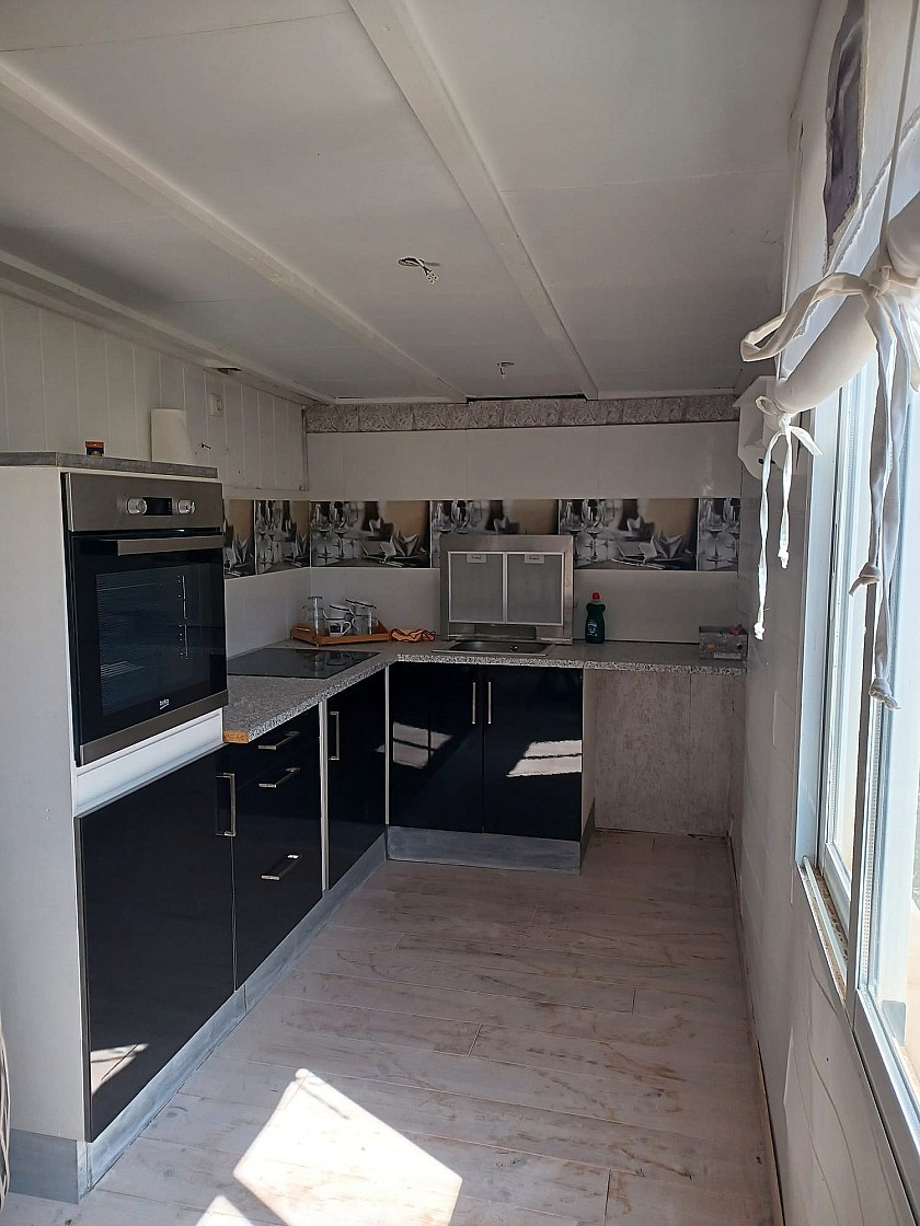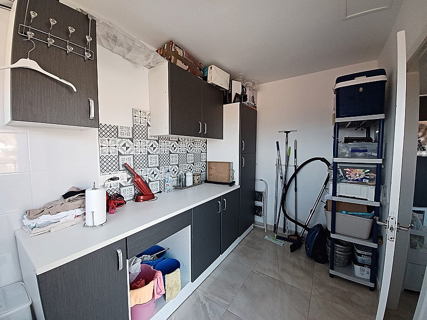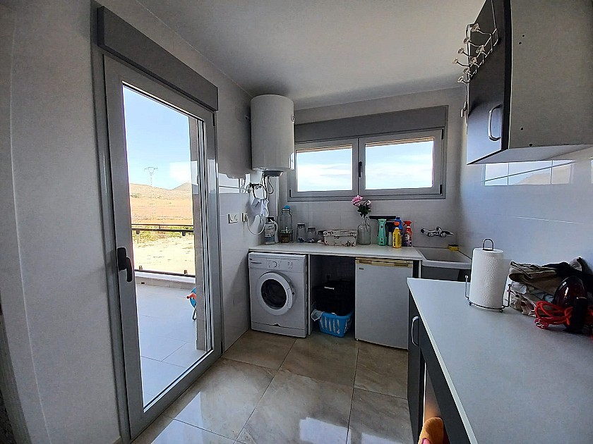 Twee gedeeltelijk beglaasde schuifdeuren leiden naar de grote, volledig ingerichte keuken met een groot raam dat wederom een prachtig uitzicht biedt. Vanuit de keuken leidt een deur naar een zeer ruime bijkeuken met plaats voor bijvoorbeeld een wasmachine, plus extra kasten en werkbladen; hier is volop opbergruimte! Er is ook een deur naar buiten, waardoor het uitladen van boodschappen of de was gemakkelijk is.